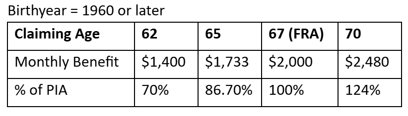 Personal benefits can be claimed anytime starting at age 62, and they max out at age 70. Table 1 above shows the amount of personal benefit you’d earn for four different claiming ages. The table assumes your primary insurance amount (PIA) to be $2000 per month. Your PIA is your monthly benefit if you claim at your full-retirement age (FRA) – which is 67 for anyone born in 1960 or later.[3] You would earn $1400 per month in “real” terms (i.e., in terms spending power) if you were to claim at age 62. In contrast, you would earn much more – $2480 per month – if you were to claim at age 70. You can find more information here.
