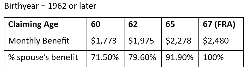 Table 2 above shows the amount of spousal benefit you’d earn for three different claiming ages – assuming that your spouse has a PIA of $2000 and has already claimed. You could earn up to $1000 per month or 50% of that PIA. You would only earn $650 per month or 32.5% of your spouse’s PIA if you were to claim at age 62. You can find more information here: https://www.ssa.gov/benefits/retirement/planner/agereduction.html.